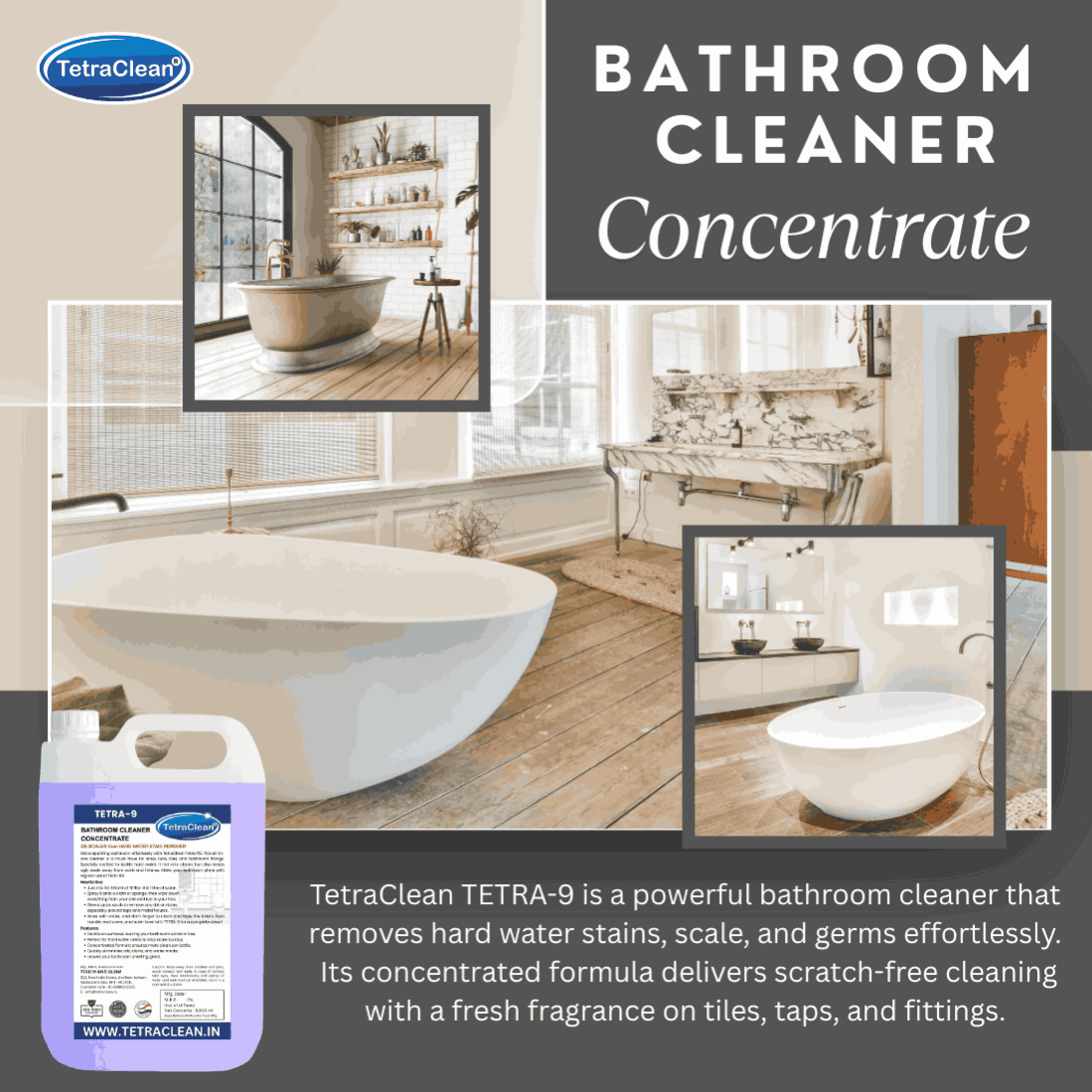 TetraClean TETRA-9 Bathroom Cleaner is a powerful concentrate that removes hard water stains, limescale, and soap scum from tiles, taps, sinks, and fittings. Its scratch-free, fresh-smelling formula ensures a spotless and hygienic bathroom.