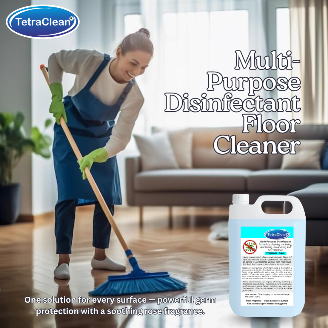 TetraClean Multi-Purpose Disinfectant Floor Cleaner is a highly concentrated and effective cleaning solution designed for complete hygiene. It cleans, disinfects, sanitizes, and deodorizes in one go, leaving behind a refreshing Aqua or Rose fragrance.