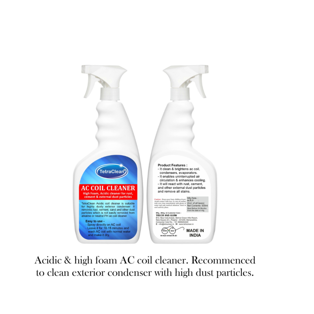 TetraClean Acidic & High Foam AC Coil Cleaner is a professional-grade formula designed to deep-clean exterior condensers and coils covered with rust, cement, and tough dust deposits. Its high-foaming acidic action penetrates deeply, reacting with metal oxides and dust buildup for effective removal without damaging the coils.