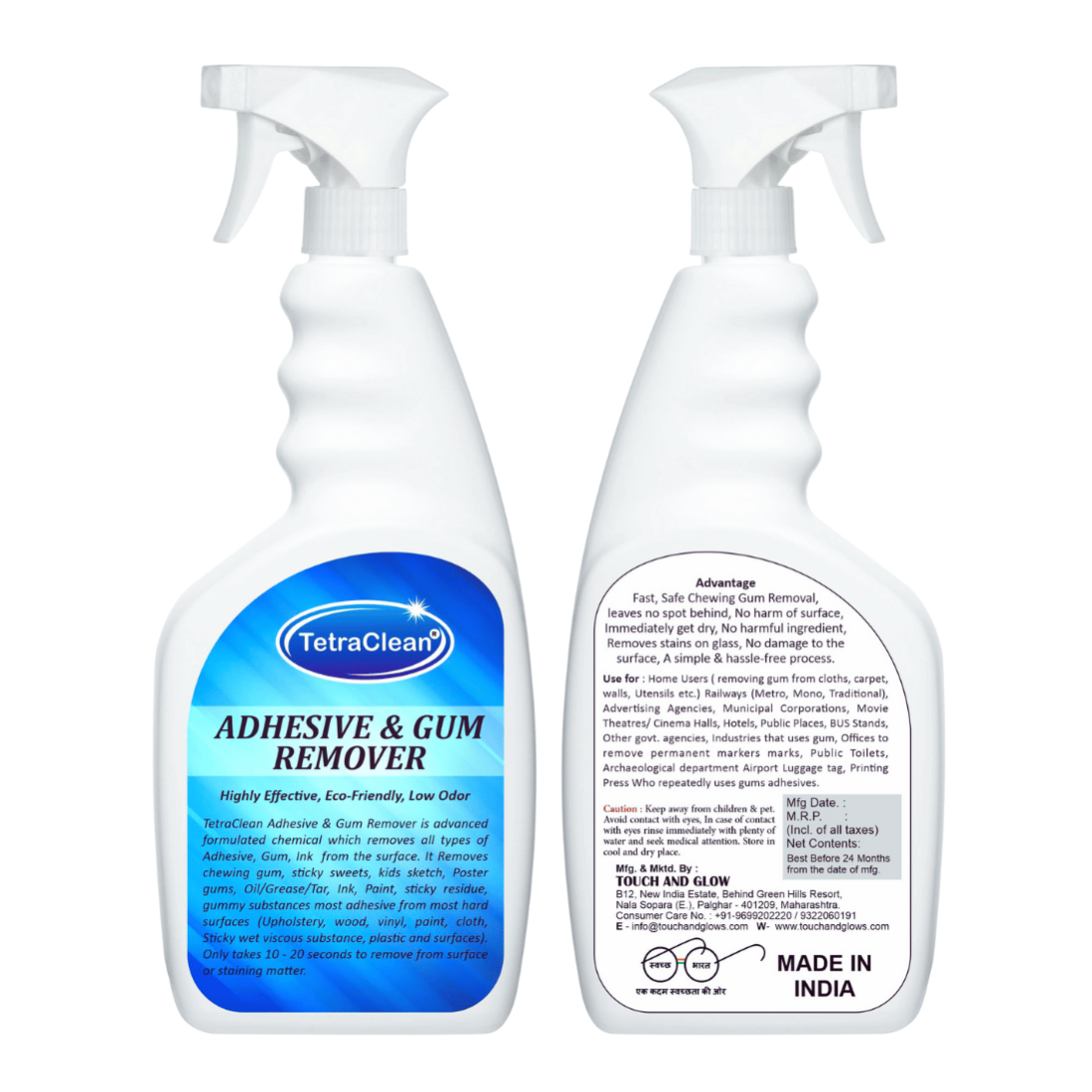 TetraClean Adhesive & Gum Remover is a powerful, advanced cleaning solution engineered to eliminate even the toughest sticky residues in seconds. Designed for fast, safe, and hassle-free removal of chewing gums, adhesives, glue, stickers, labels, tape marks, ink stains, oily residues, and tar from a wide range of surfaces, it makes everyday cleaning simple and effective. This eco-friendly, low-odor formula works on glass, metal, plastic, vinyl, wood, painted surfaces, fabrics, upholstery, and more—without leaving stains or causing damage. Just spray on the affected area, wait for 10–20 seconds, and wipe clean to achieve a spotless finish.