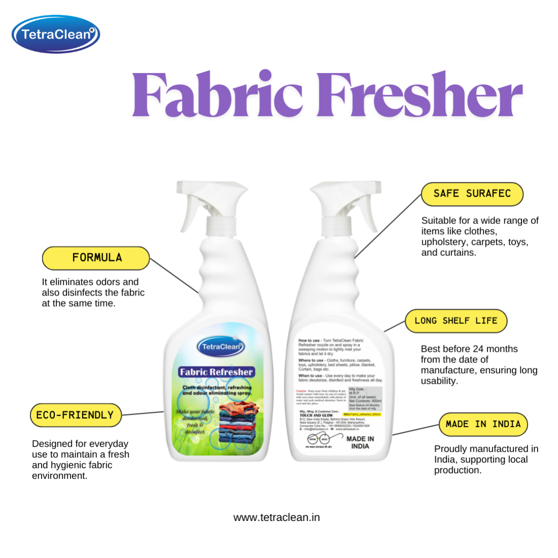 Quickly eliminate odors and disinfect fabrics with TetraClean Fabric Refresher. Enjoy instant freshness and a pleasant scent—perfect for clothes, upholstery, carpets, curtains, and more
