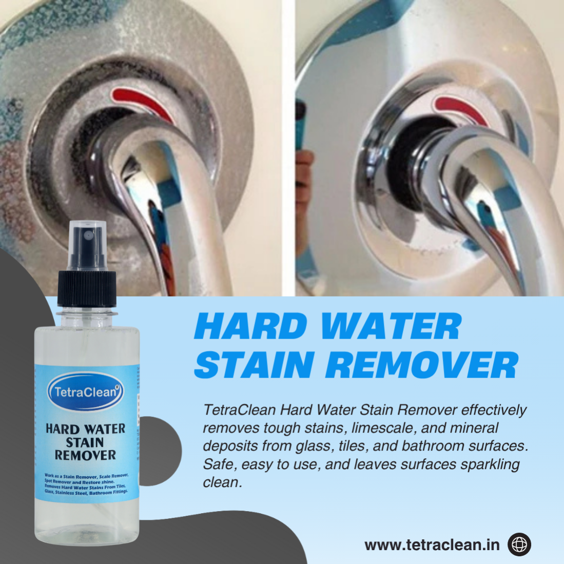 TetraClean Hard Water Stain Remover is a powerful yet safe cleaner specially formulated to eliminate stubborn hard water stains, limescale, calcium deposits, and mineral buildup from glass, tiles, faucets, bathroom fittings, and stainless steel surfaces.