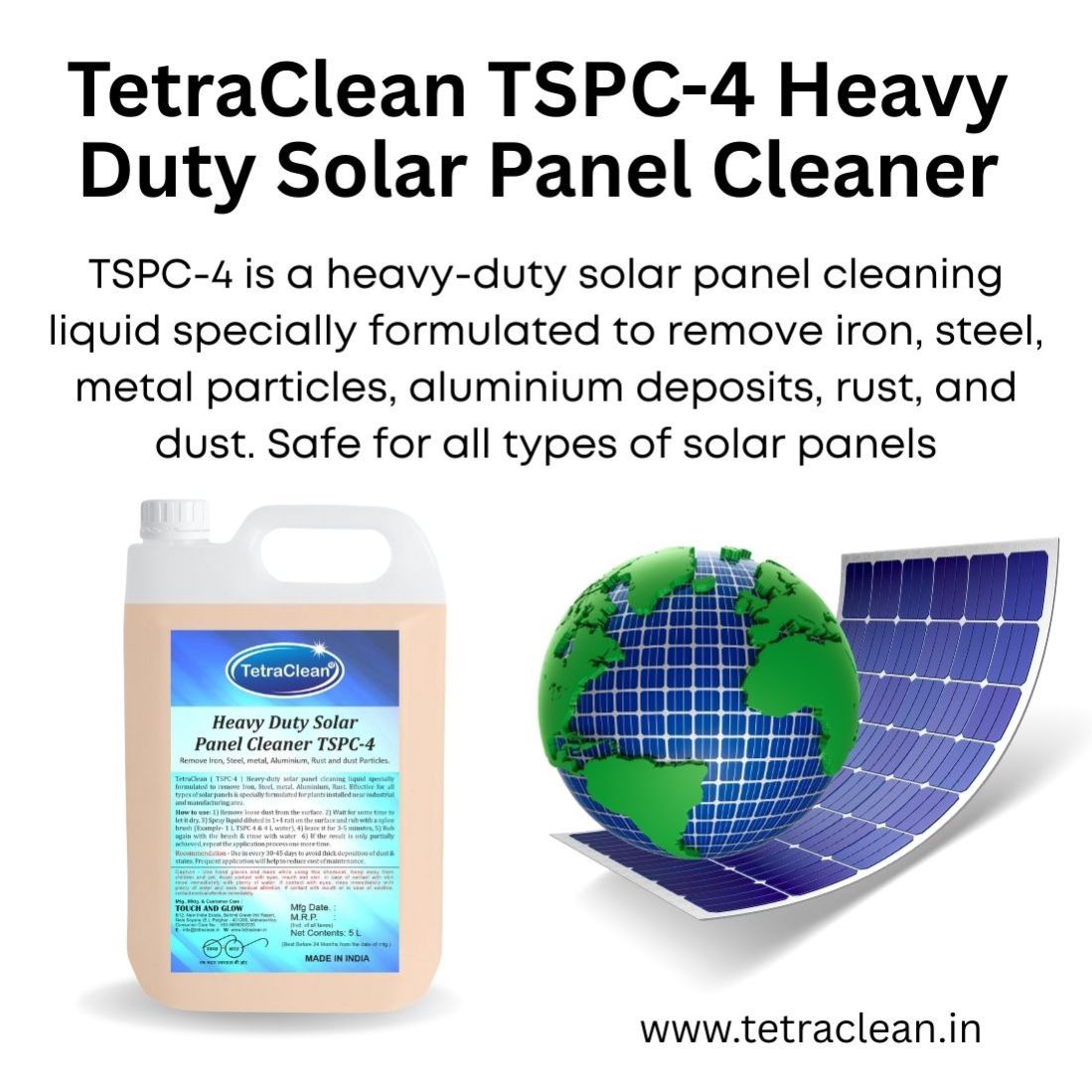 TetraClean Heavy Duty Solar Panel Cleaner TSPC-4 is a powerful cleaning solution designed for solar panels exposed to metallic dust, rust, and industrial pollutants. Its advanced formula effectively removes iron, steel, aluminium, rust stains, and fine dust particles, ensuring maximum solar efficiency and durability.