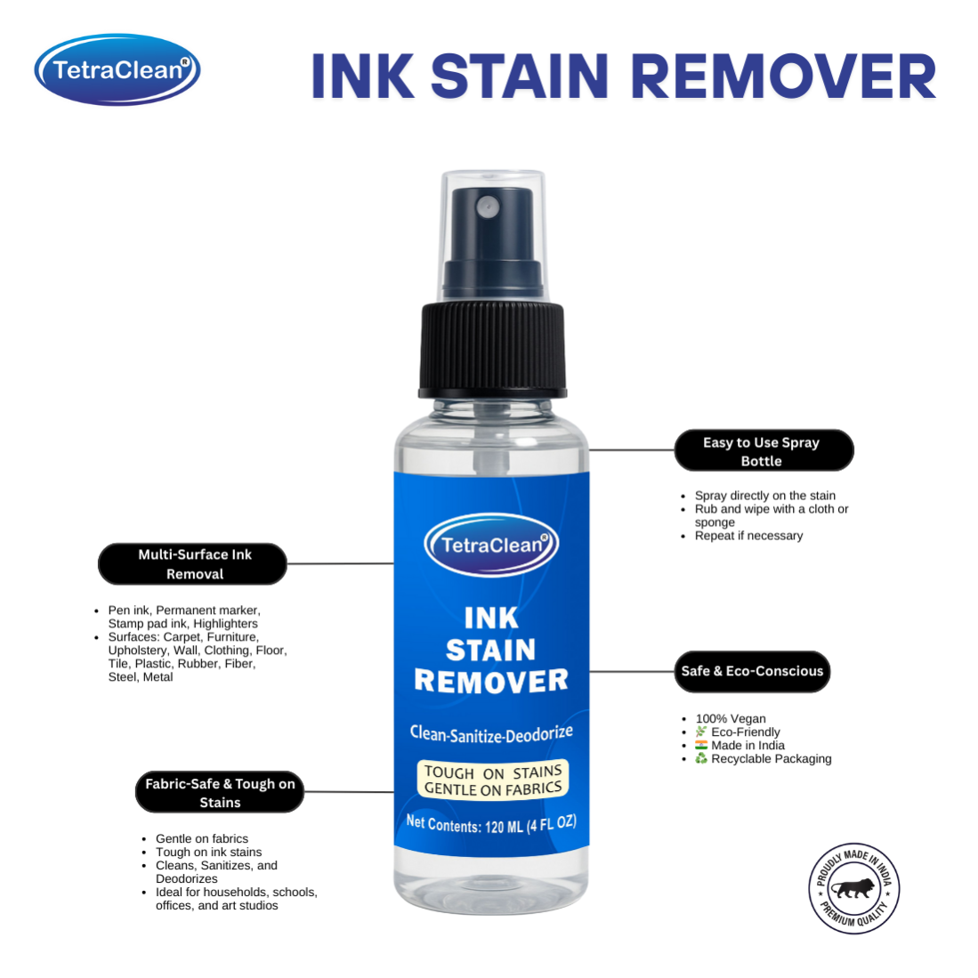 TetraClean Ink Stain Remover Spray – Multi-Surface, Fabric-Safe Ink & Marker Stain Cleaner (Available in 120ml & 500ml & 5L)