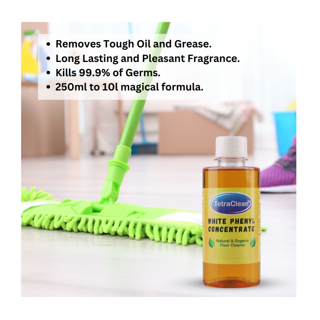 Tetraclean White Phenyl 250ml is a professional-grade floor and surface cleaner designed to provide deep cleaning, shine, and germ protection. Its advanced formula effectively removes dirt, grease, and tough stains while eliminating harmful bacteria and germs. Ideal for cleaning floors, toilets, bathrooms, and washable surfaces, this phenyl not only keeps your space clean but also ensures a safe and hygienic environment. Suitable for daily use in homes, schools, offices, hospitals, and other public places.