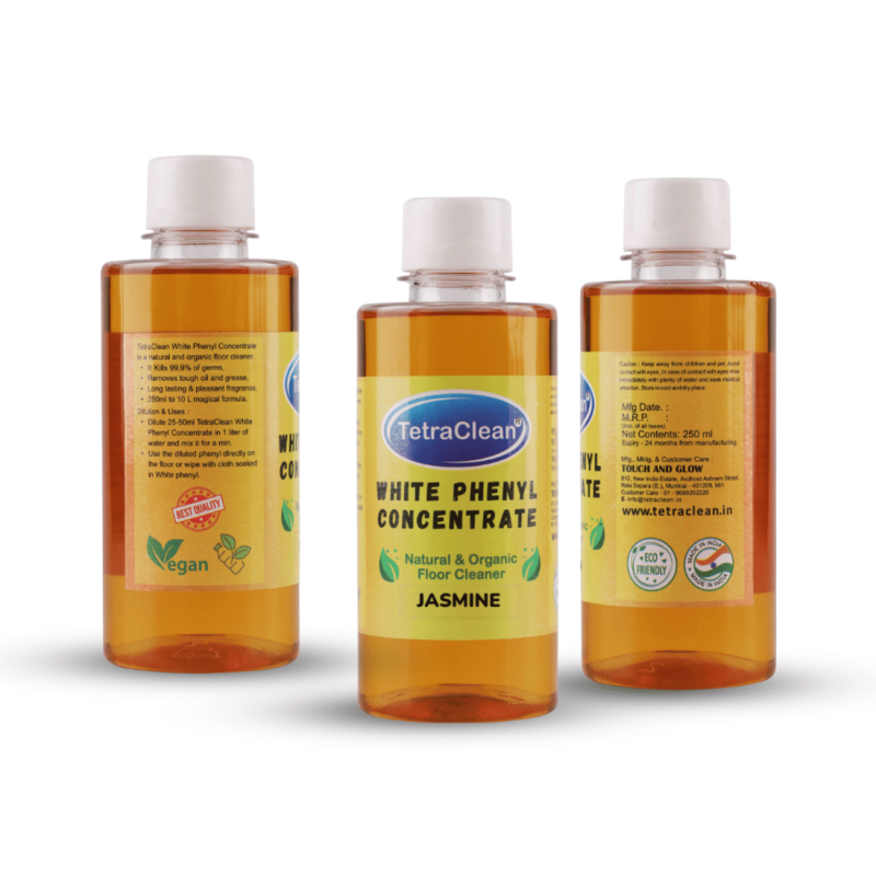 Antibacterial and eco-friendly TetraClean White Phenyl Concentrate delivers powerful floor cleaning with long-lasting fragrances of lemon, lemongrass, mogra, jasmine, lavender, pine, rose, citronella, and camphor. Removes stains, kills germs, and leaves your home fresh and vibrant.