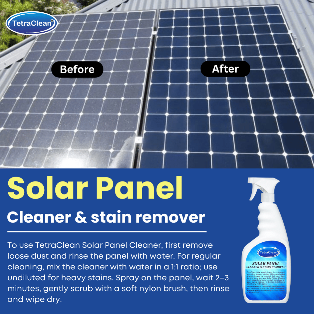 TetraClean® Solar Panel Cleaner is a streak-free, non-abrasive cleaning solution designed to remove dust, dirt, bird droppings, and hard-water deposits from solar panels. It enhances light absorption, improves panel efficiency, and leaves a spotless, shiny surface. Safe for all types of solar panels—residential, commercial, and industrial.