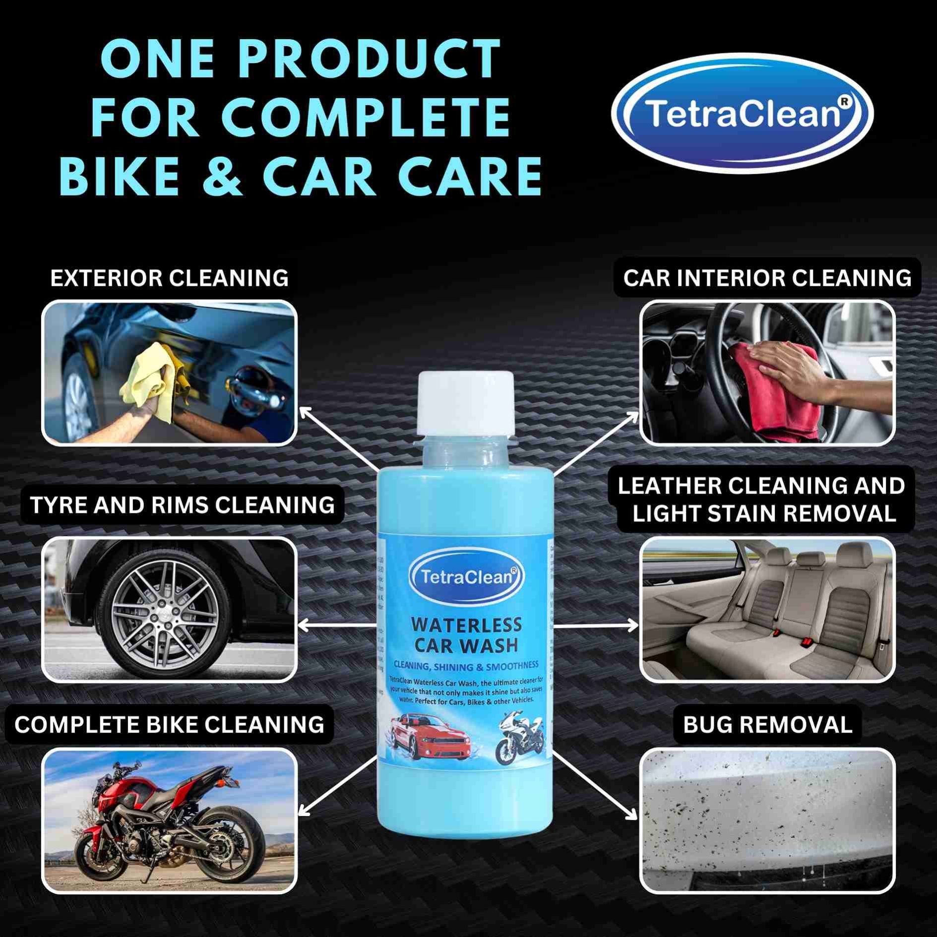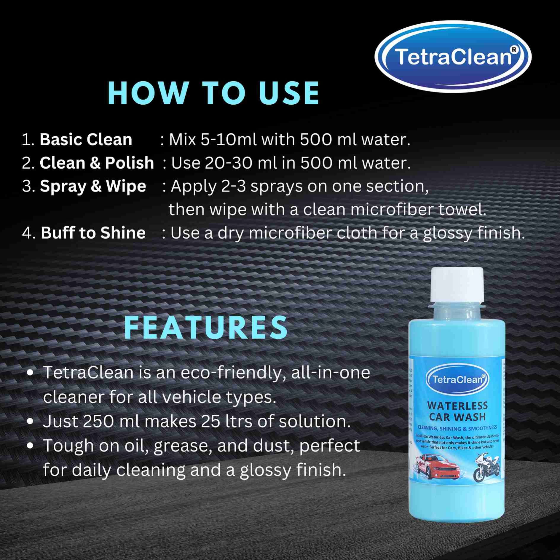 Give your vehicle a showroom-like shine in minutes with TetraClean Waterless Car Wash, the perfect all-in-one cleaning solution for cars, bikes, and other vehicles. Designed for effortless cleaning without water, this advanced formula removes dust, dirt, grime, and light stains while adding a rich, glossy finish.