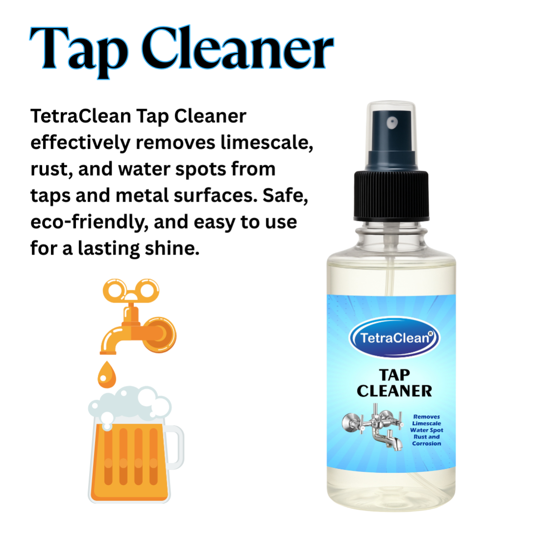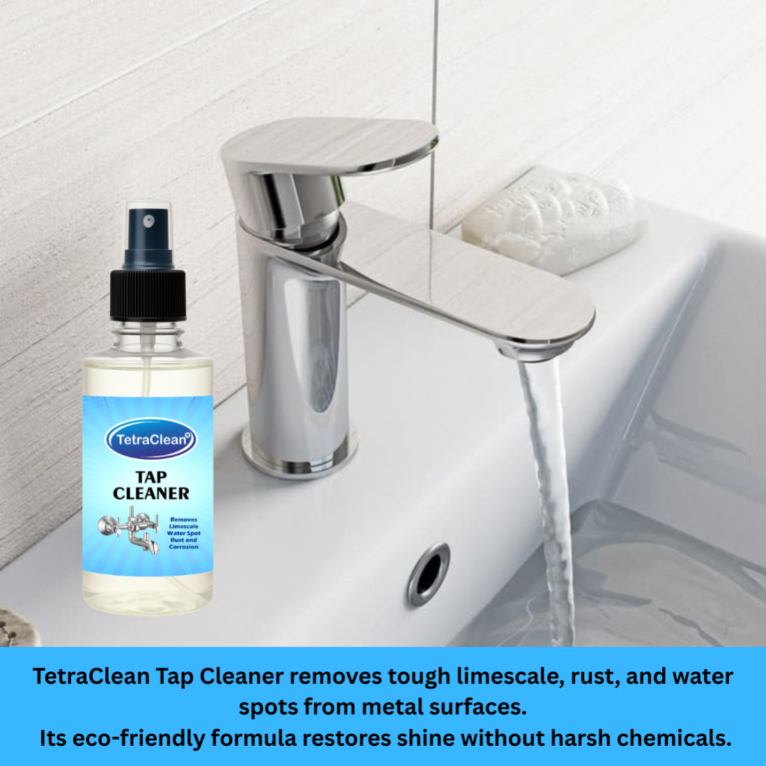 TetraClean Tap Cleaner Spray is a powerful yet safe cleaning solution specially formulated to remove tough water stains, limescale, soap scum, rust marks, and dirt deposits from taps, faucets, and bathroom fittings. Its advanced descaling formula penetrates stubborn stains and restores the natural shine of chrome, steel, and metal surfaces without causing any damage.