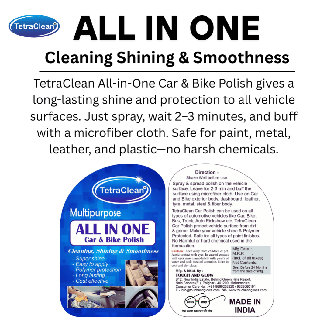 TetraClean All-in-One Car & Bike Polish is a multipurpose formula designed to give your vehicle a super shine, long-lasting protection, and smooth finish. It works effectively on car and bike exteriors, dashboards, leather, tyres, plastic, steel, and fiber surfaces. This easy-to-use spray not only enhances the look of your vehicle but also protects it from dirt, grime, and environmental damage. Free from harsh chemicals, it is safe for all paint finishes and surfaces, ensuring your car or bike always looks brand new.