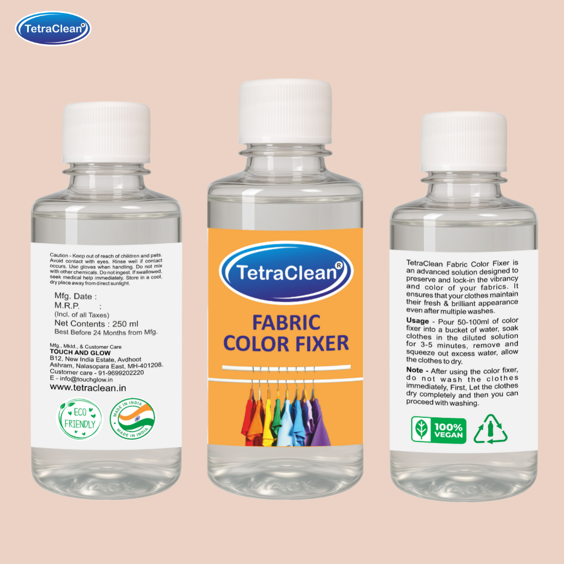 TetraClean Fabric Color Fixer is an advanced fabric care solution specially formulated to lock in colors and prevent fading or bleeding during washing. It helps preserve the original brightness of your clothes, ensuring they look fresh and vibrant wash after wash. Suitable for both hand wash and bucket wash, this color fixer works effectively on cotton, silk, wool, and synthetic fabrics. Ideal for new garments as well as frequently washed clothes, it enhances fabric life while maintaining color intensity.