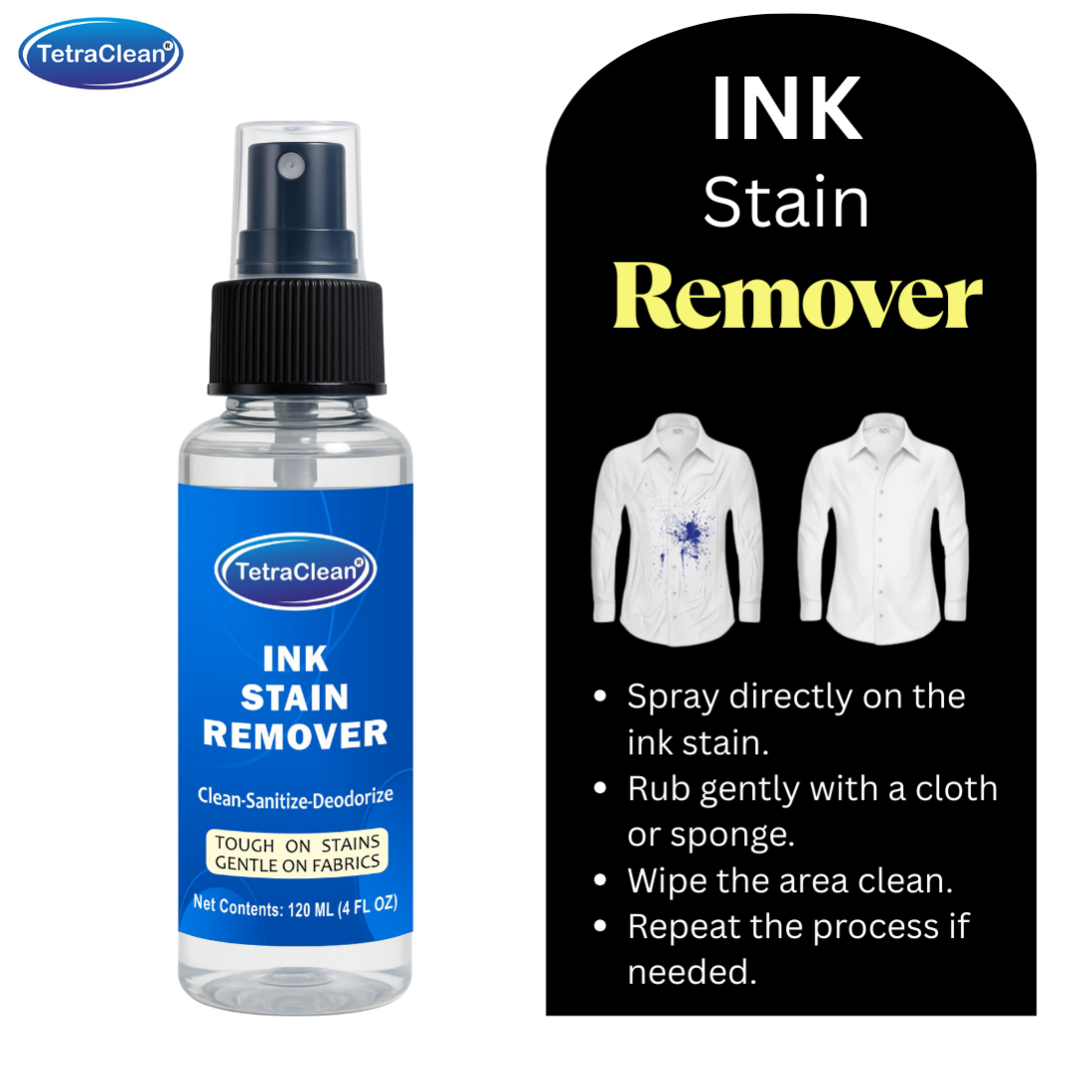 TetraClean Ink Stain Remover Spray – Multi-Surface, Fabric-Safe Ink & Marker Stain Cleaner (Available in 120ml & 500ml & 5L)
