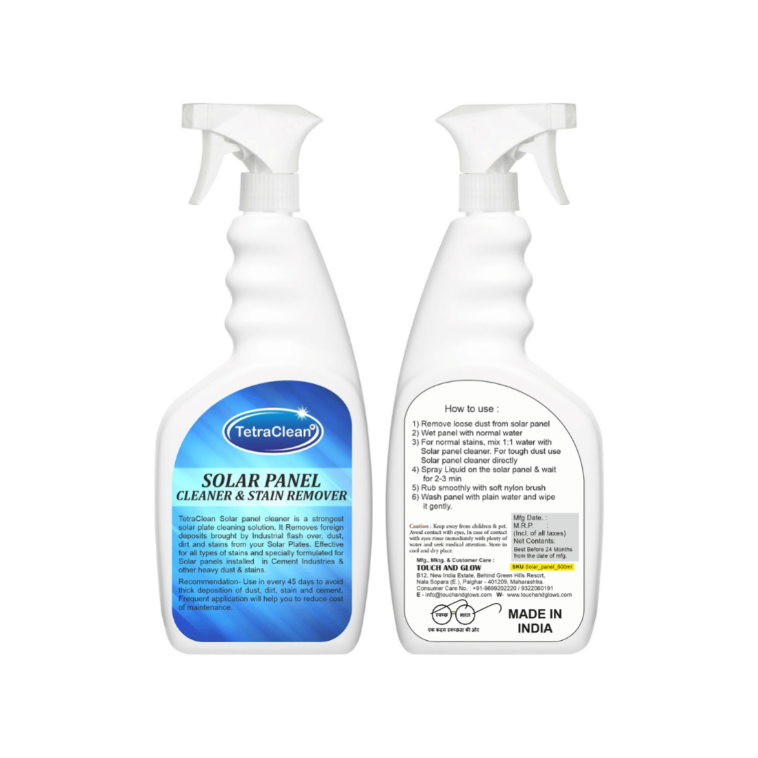 TetraClean® Solar Panel Cleaner is a streak-free, non-abrasive cleaning solution designed to remove dust, dirt, bird droppings, and hard-water deposits from solar panels. It enhances light absorption, improves panel efficiency, and leaves a spotless, shiny surface. Safe for all types of solar panels—residential, commercial, and industrial.