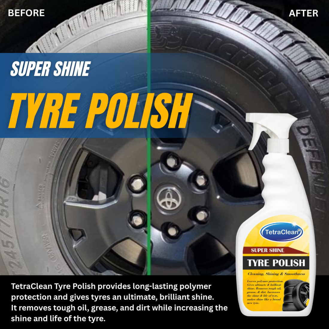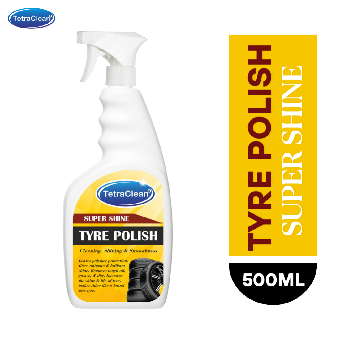 TetraClean Super Shine Tyre Polish restores dull tyres with a brilliant black shine, removes dust and grime, and adds long-lasting polymer protection to keep tyres looking like new. Suitable for cars, bikes, trucks, and more.