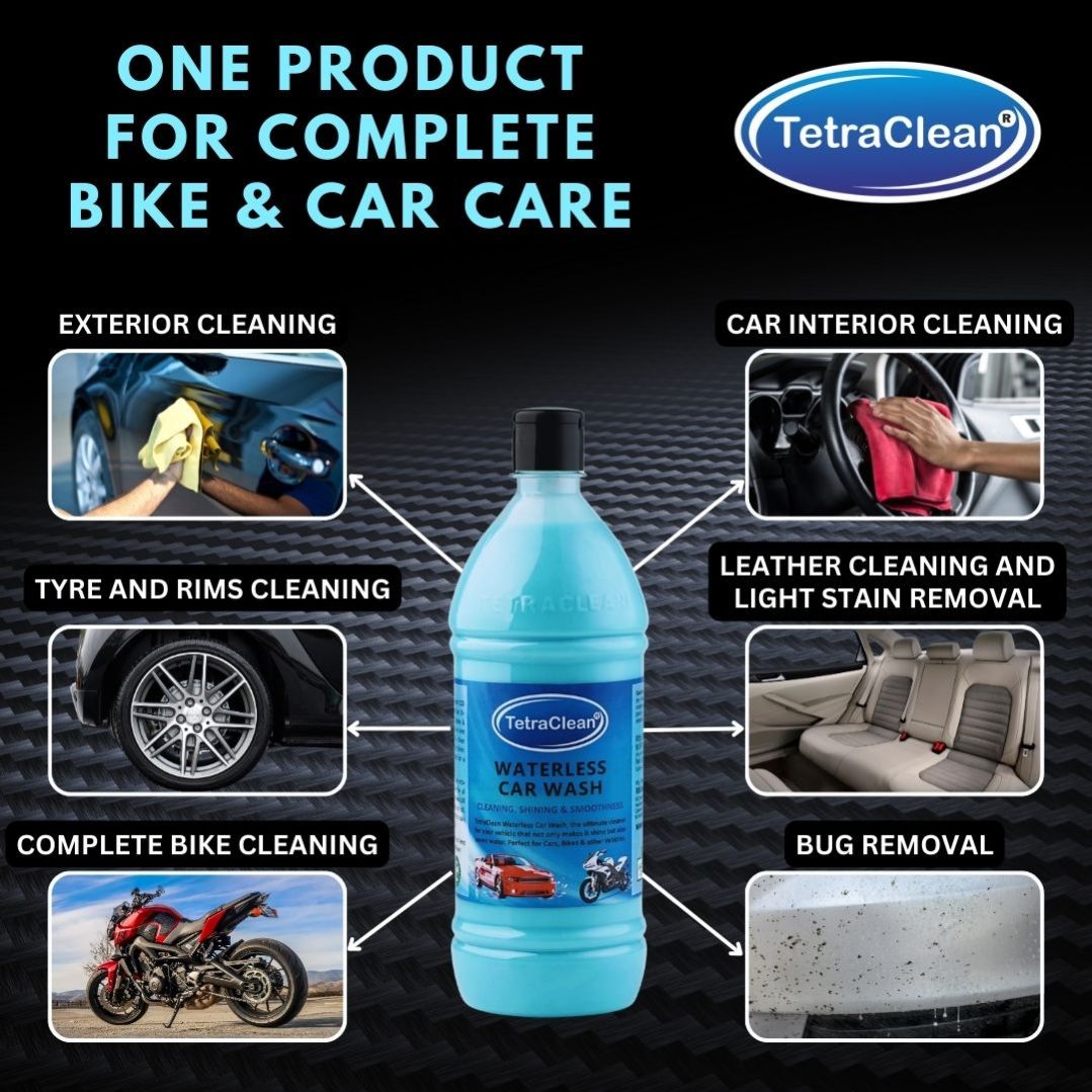 TetraClean® Waterless Car Wash is a highly concentrated, eco-friendly vehicle cleaner that removes dust, dirt, stains, and grime without using water. It cleans, shines, and protects your car or bike in minutes while giving a smooth, glossy finish. Suitable for all vehicle surfaces and highly cost-effective—5L cleans up to 500 cars.